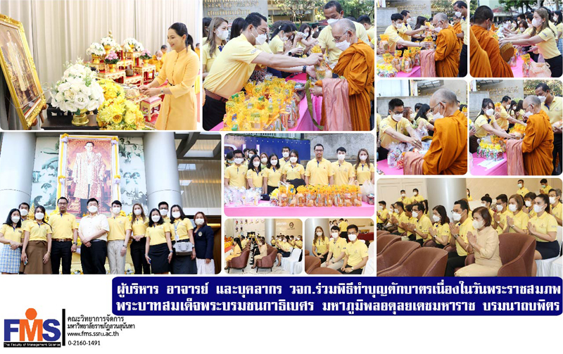 On December 2, 2022 at 7:00 a.m., Assistant Professor Dr. Somsak Klaysung, Dean of the Faculty of Management Science together with the Deputy Dean, professors and personnel of the Faculty Participate in the merit-making ceremony on the occasion of the birthday of His Majesty the King His Majesty King Bhumibol Adulyadej Maha Bhumibol Adulyadej the Great Borommanatbophit by Associate Professor Dr. Chutikan Sriwiboon, President of Suan Sunandha Rajabhat University presided over the ceremony Light incense and candles to worship the Triple Gems incense, candle, little goldware Mahapong Sukul and offering Thai Dharma factors Along with giving alms to 10 monks at the front of the office of the president Suan Sunandha Rajabhat University.