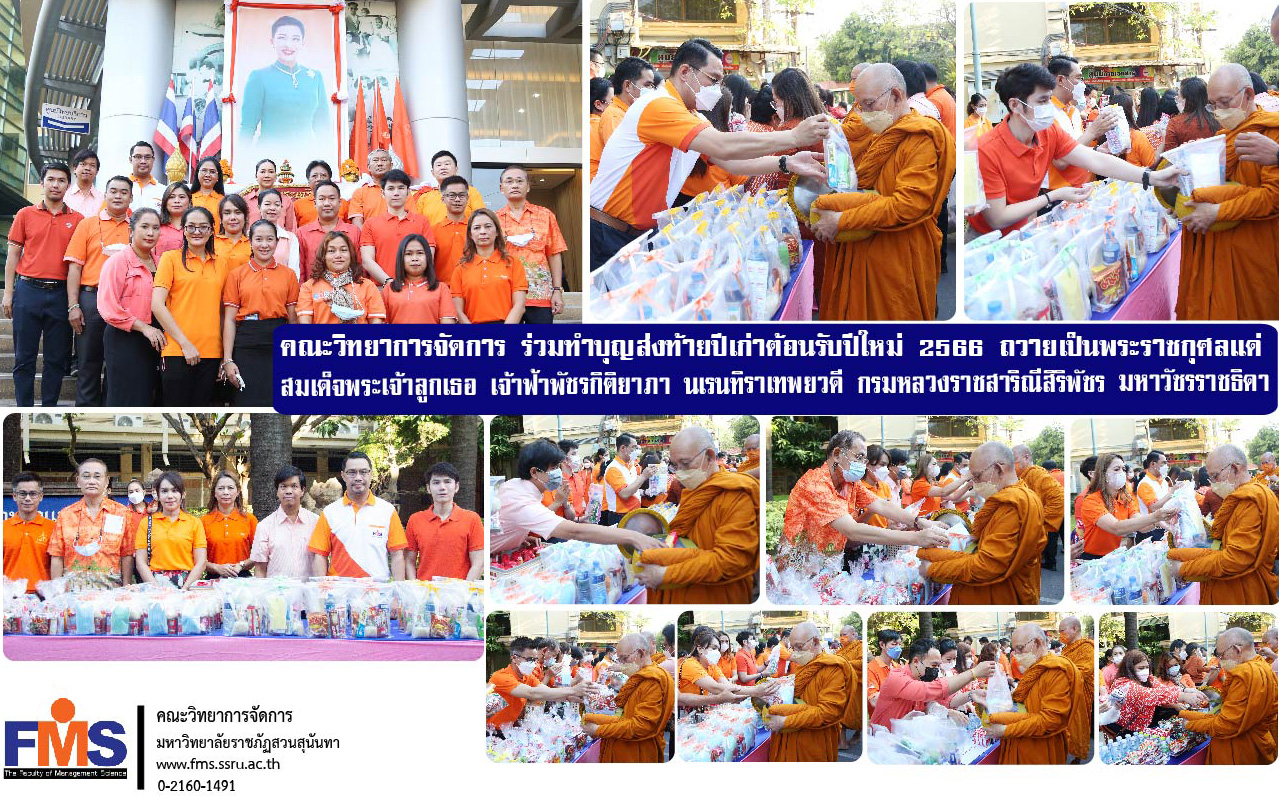 On December 23, 2022 at 7:00 a.m., Assistant Professor Dr. Somsak Klaysung, Dean of the Faculty of Management Science together with the Deputy Dean, professors, and academic support personnel of the Faculty Participating in the New Year's Eve merit-making ceremony and welcoming the New Year 2023 as a royal charity Her Royal Highness Princess Maha Chakri Sirindhorn Prince Patcharakitiyabha Narentira Thep Yowadee Kromluang Ratchasarinee Siriphat Maha Watcharajthida recovered from his illness and quickly returned to good health by Associate Professor Dr. Chutikan Sriwiboon, President of Suan Sunandha Rajabhat University presided over the morning meal and offered food to 19 monks at the front of the office of the President Suan Sunandha Rajabhat University.