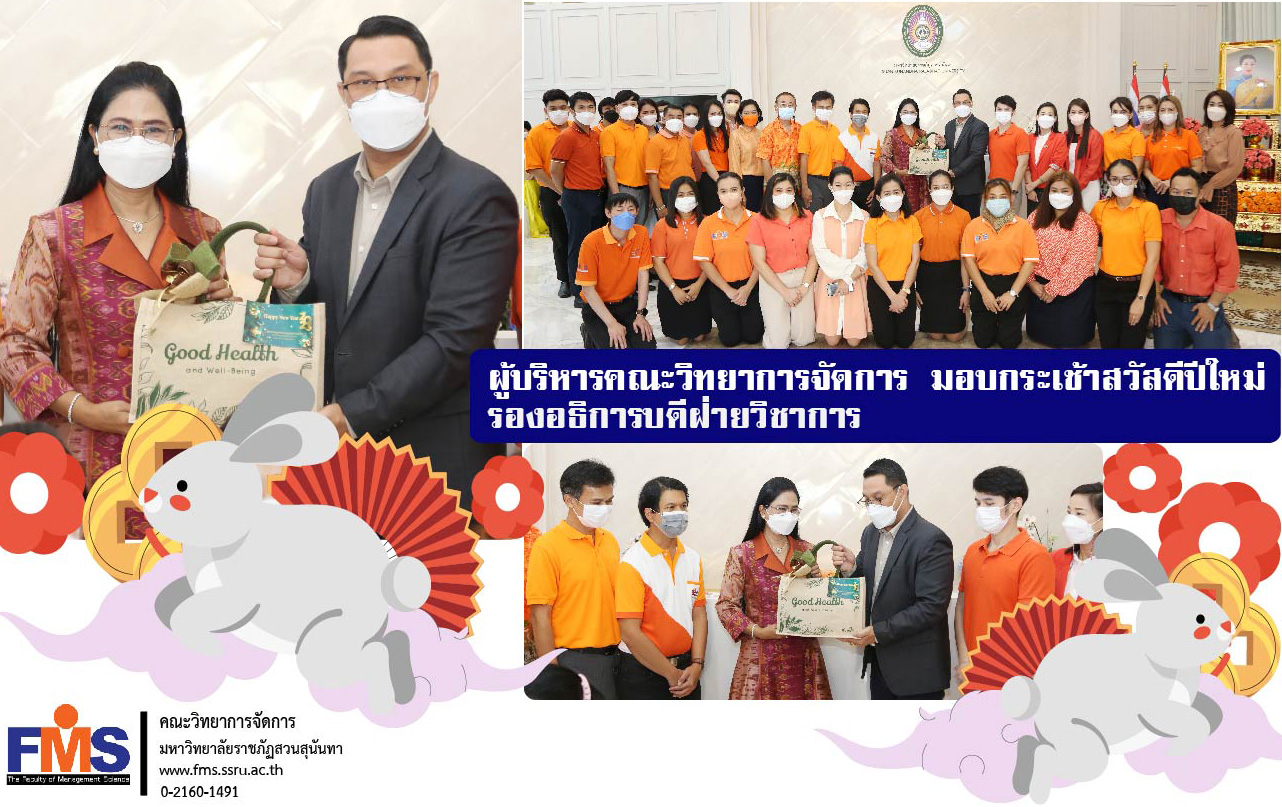 On December 23, 2022, the Faculty of Management Science led by Assistant Professor Dr. Somsak Klaysung, Dean, along with Associate Dean, Professor, Head of the Dean's Office. and academic support personnel met and gave New Year's gift baskets to Associate Professor Dr. Nantiya Noichan, Vice President for Academic Affairs On the occasion of the New Year's Day 2023 at the Office of the President, 5th floor, Suan Sunandha Rajabhat University.