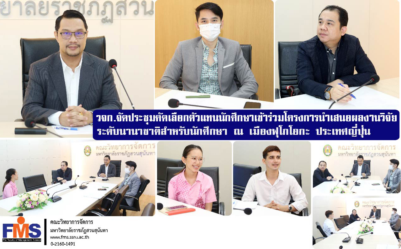 On January 4, 2023, 9:00 a.m. - 12:00 p.m. Faculty of Management Sciences Suan Sunandha Rajabhat University Organized an interview meeting to select student representatives from the Faculty of Management Sciences to receive a scholarship for an international research presentation project for students in Fukuoka Japan organized by the Language Institute by Assistant Professor Dr. Somsak Klaysung, Dean of the Faculty of Management Science chairman Assistant Professor Dr. Nattapong Techaratanaset Associate Dean for Research and Academic Services Vice Chairman and Assistant Professor Dr. Pisit Pojanjaruwit, Head of Business Administration Program Join as an interview committee Follow the announcement of the selection results on Facebook fanpage, Faculty of Management Science, Suan Sunandha Rajabhat University.
