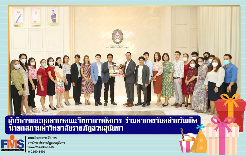 Assistant Professor Dr. Somsak Klaysung, Dean of the Faculty of Management Sciences along with the Deputy Dean, professors, head of the Dean's Office and academic support personnel delivered fruit baskets and gave blessings to Associate Professor Dr. Ruedej Kerdwichai, Council President of Suan Sunandha Rajabhat University. On the occasion of the birthday on February 22, 2023 at the reception room of the Office of the President, Building 31, 1st floor.