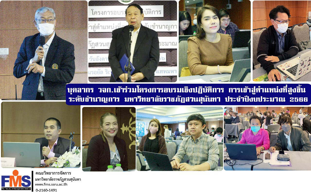 On February 28, 2023, the Faculty of Management Science personnel led by Ms. Jinjutha Srihera, Head of the Dean's Office together with Acting Head of Planning and Quality Assurance Department Acting Head of Research and Academic Services and academic support personnel of the Faculty Participate in the workshop program "Reaching a higher position Expert level Suan Sunandha Rajabhat University Fiscal Year 2023" organized by the Division of Personnel Management with Associate Professor Pissanu Poonpetchapan, Advisor to the President for Legal Affairs Presided over the opening ceremony of the project and was honored by Associate Professor Dr. Wittaya Mekkham, Vice President for Planning and Quality Assurance lecturer "Progress Path of University Employees" and Mr. Chamni Nilarun, Acting Director of the Office of the President lecturer "Writing a job appraisal to enter a higher position" has the head of the office. Department heads and academic support personnel from the Faculty Various agencies participated in the training at The Royal River Hotel, Bangkok.