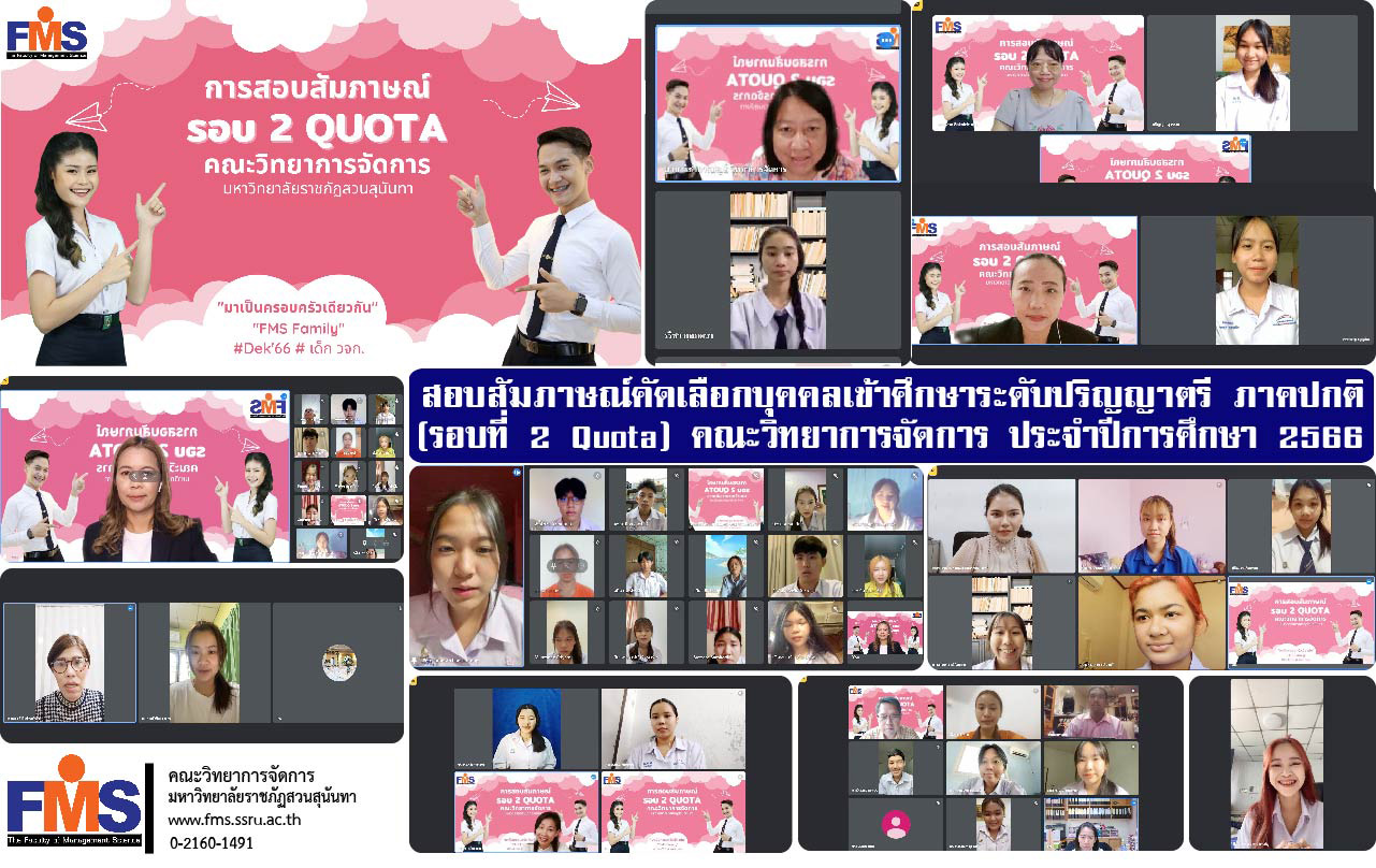 On April 19, 2023, Suan Sunandha Rajabhat University conducting an interview for selecting people to study in the undergraduate degree, normal program, academic year 2023 (Round 2 Quota, type of academic ability and Phet Sunandha Scholarship Program) in online form by the Faculty of Management Sciences. There are students taking an interview in each field/field of study, namely Accounting. Department of Business Economics Business Administration majors include Marketing International Business Human Resource Management Banking and Finance Business Entrepreneurship and service business management In which all candidates bring their knowledge, ability and work to fully present to the examination committee. which the interview went well follow up interview results and more details at www.admission.ssru.ac.th