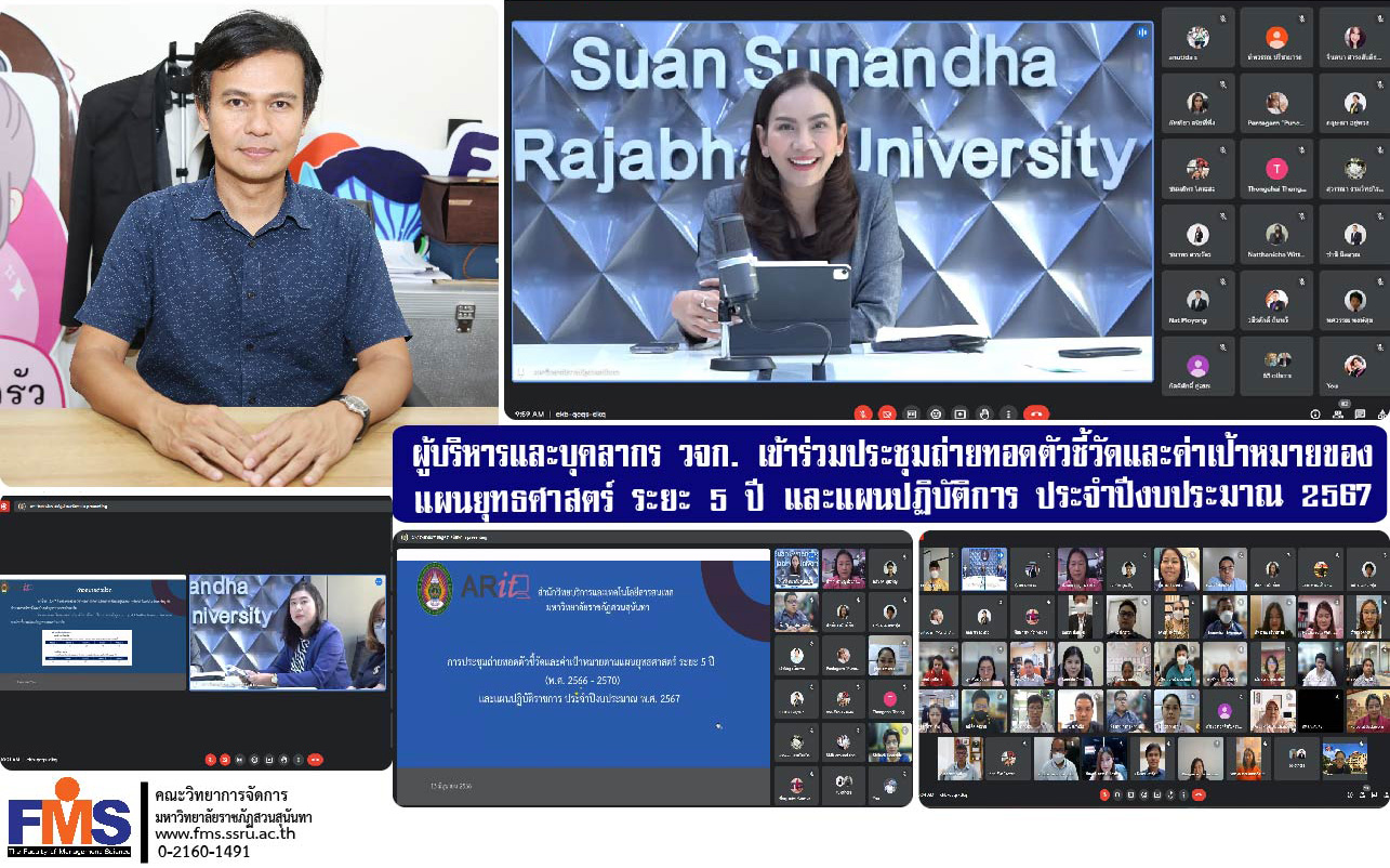 On June 13, 2023 at 10 a.m.Mr. Pitimanas Bunlue, Deputy Dean for Administration, Faculty of Management Sciences together with Ms. Phakaporn Dechanan, Acting Head of General Administration Department Mr. Kripakorn Boonma Computer Academician and Ms. Kanyakorn Sujarittnetikarn Publicist attended the meeting to convey indicators and target values of the 5-year strategic plan (2023-2027) and action plans. Fiscal Year 2024, organized by the Office of Academic Resources and Information Technology Suan Sunandha Rajabhat University with assistant professor Dr. Sirilak Ketchai, Director of the Office of Academic Resources and Information Technology presided over the meeting To clarify the guidelines for the preparation of the action plan according to the indicators. In the form of an online meeting (Google Meet).