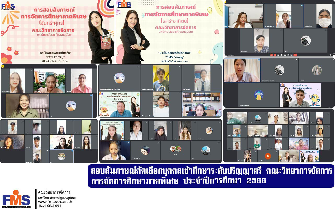 On June 16, 2023, Suan Sunandha Rajabhat University Organize interviews to select people to study undergraduate special education management (Monday-Friday) and (Saturday-Sunday) academic year 2023 in online form by the Faculty of Management Sciences There are students taking an interview in each field/field of study, namely Accounting. Business Administration majors include Marketing Human Resource Management and service business management which the interview went well follow up interview results and more details at www.admission.ssru.ac.th.