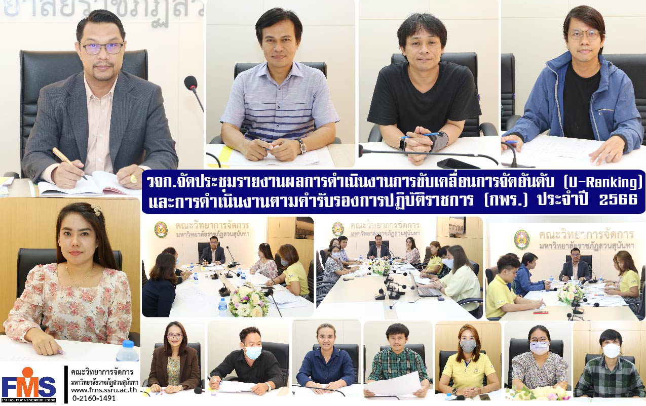 On June 19, 2023, Faculty of Management Sciences, Suan Sunandha Rajabhat University organized a meeting to report on the results of driving the Suan Sunandha Rajabhat University ranking (U-Ranking) and report on the results according to the certification of government officials (OCD) as well as discuss and review indicators and guidelines. and includes the presentation of strategic indicators Fiscal Year 2024, with Assistant Professor Dr. Somsak Klaysung, Dean of the Faculty of Management Sciences presided over the meeting There are vice deans in every department. Head of the Dean's Office, Head of Department and personnel from all departments attended the meeting at Ruamjai Management Meeting Room Faculty of Management Sciences.
