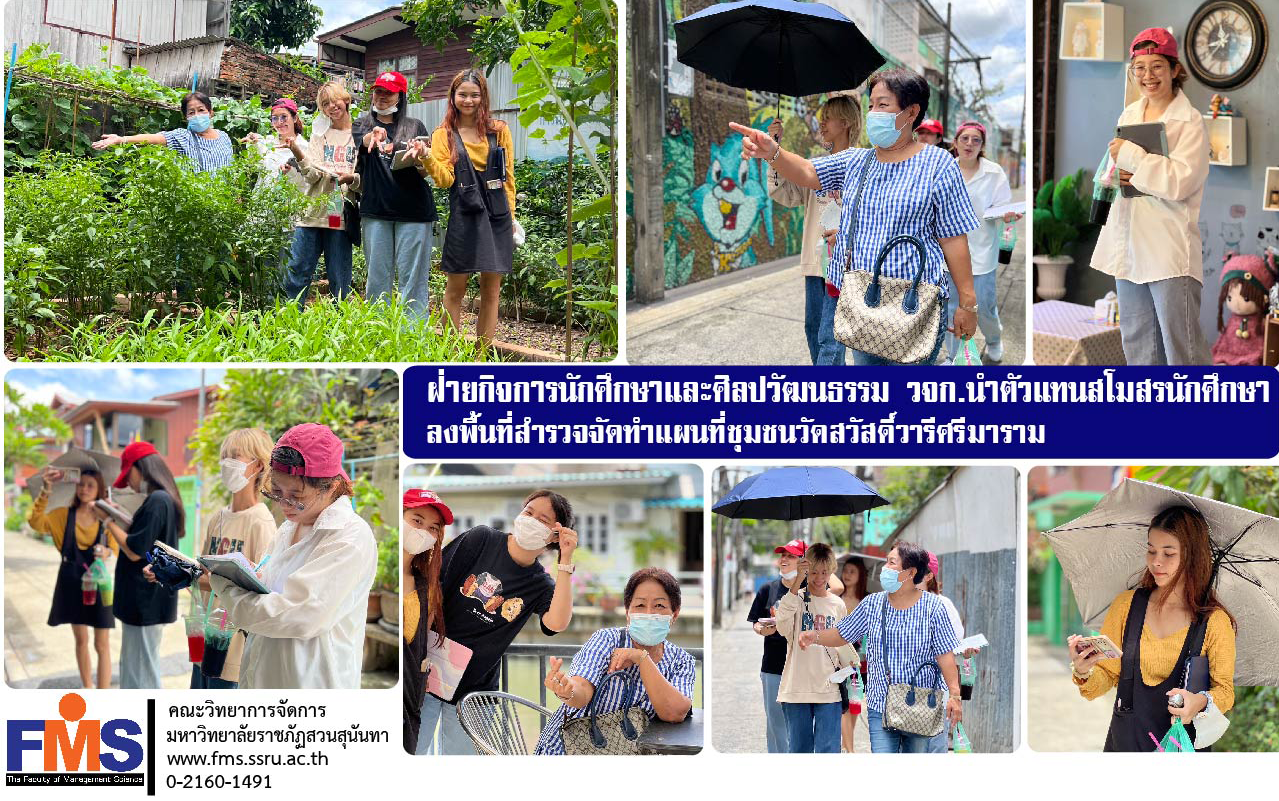 On July 25, 2023 Student Affairs and Arts and Culture Department, Faculty of Management Sciences Suan Sunandha Rajabhat University lead a team of leaders and student club representatives. Visiting the community of Wat Sawat Waree Sri Maram, Dusit District, Bangkok to carry out community mapping for community public relations to outsiders which was honored by Ms. Naiyana Yoljoho, the community chairman of Wat Sawat Waree Sri Maram Welcome and lead the team to explore the repository surrounding the community. for fieldwork and mapping activities It will continue to be held on July 29, 2023, with the delivery of maps to the community in the next order.
