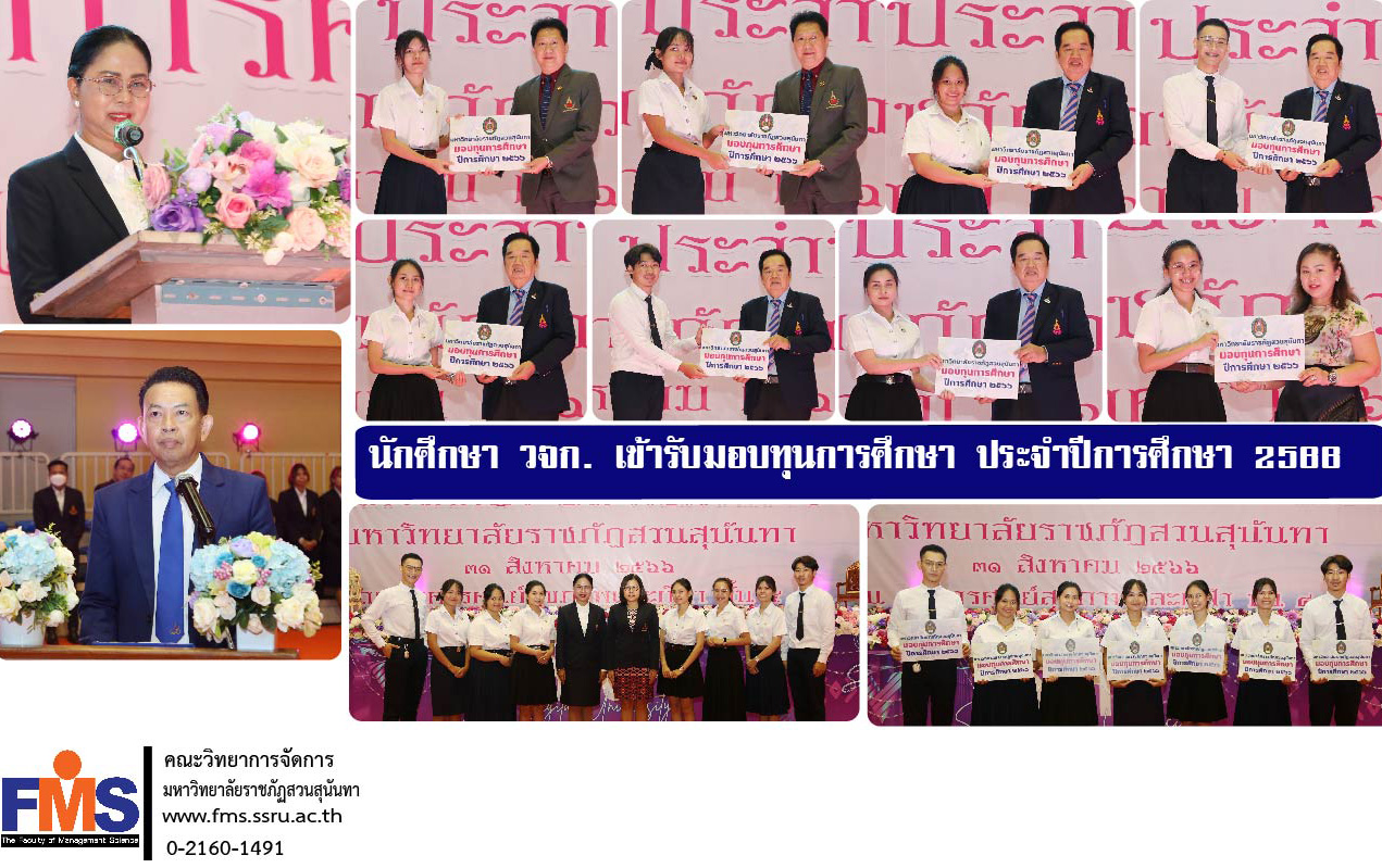 On August 31, 2023, Suan Sunandha Rajabhat University organize a scholarship awarding ceremony Academic year 2023 at the Suan Sunandha Health and Sports Center building. Suan Sunandha Rajabhat University with Associate Professor Dr. Nantiya Noichan, Vice President for Academic Affairs presided over the ceremony and assistant professor Dr. Chetsarit Angsukanchanakun Vice President for Student Affairs gave a report on this occasion to students of the Faculty of Management Science. Suan Sunandha Rajabhat University a total of 8 people received scholarships. Academic year 2023 for organizing the said scholarship award ceremony. Organized to promote and support scholarships for students with good behavior. shortage of capital and assisting with university activities To be able to live efficiently and graduate in higher education. Faculty of Management Sciences Congratulations to the students who received scholarships on this occasion.