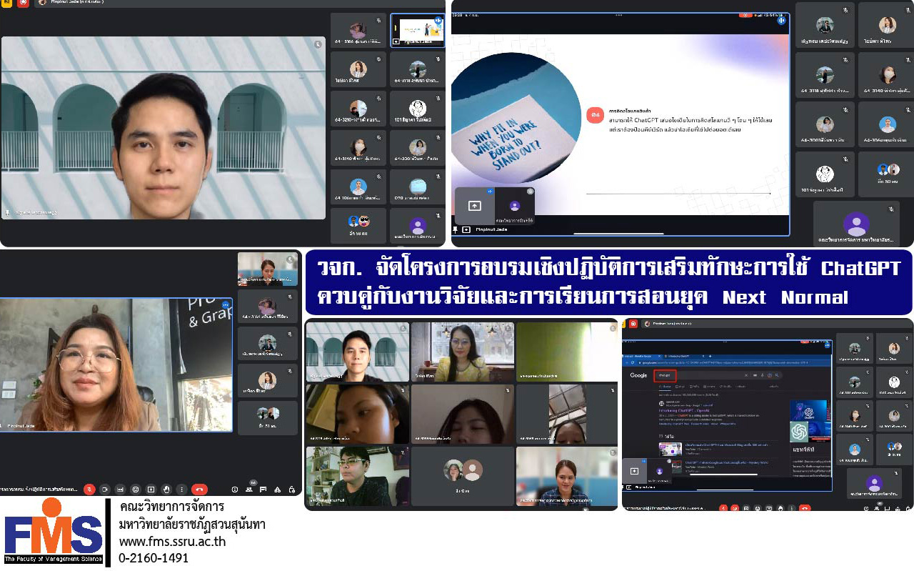 Research Development and Academic Services Department Faculty of Management Sciences ,Suan Sunandha Rajabhat University organized a workshop project to enhance ChatGPT skills along with research and teaching in the Next Normal era by Assistant Professor Dr. Natthaphong Techaratanaset. Deputy Dean for Research and Academic Services along with personnel from the Research Development and Academic Services Department carry out the project It was organized with the aim of enhancing the knowledge and understanding of the use of the ChatGPT tool to enhance the efficiency of research and teaching among faculty and students. Via the online channel Google Meet.