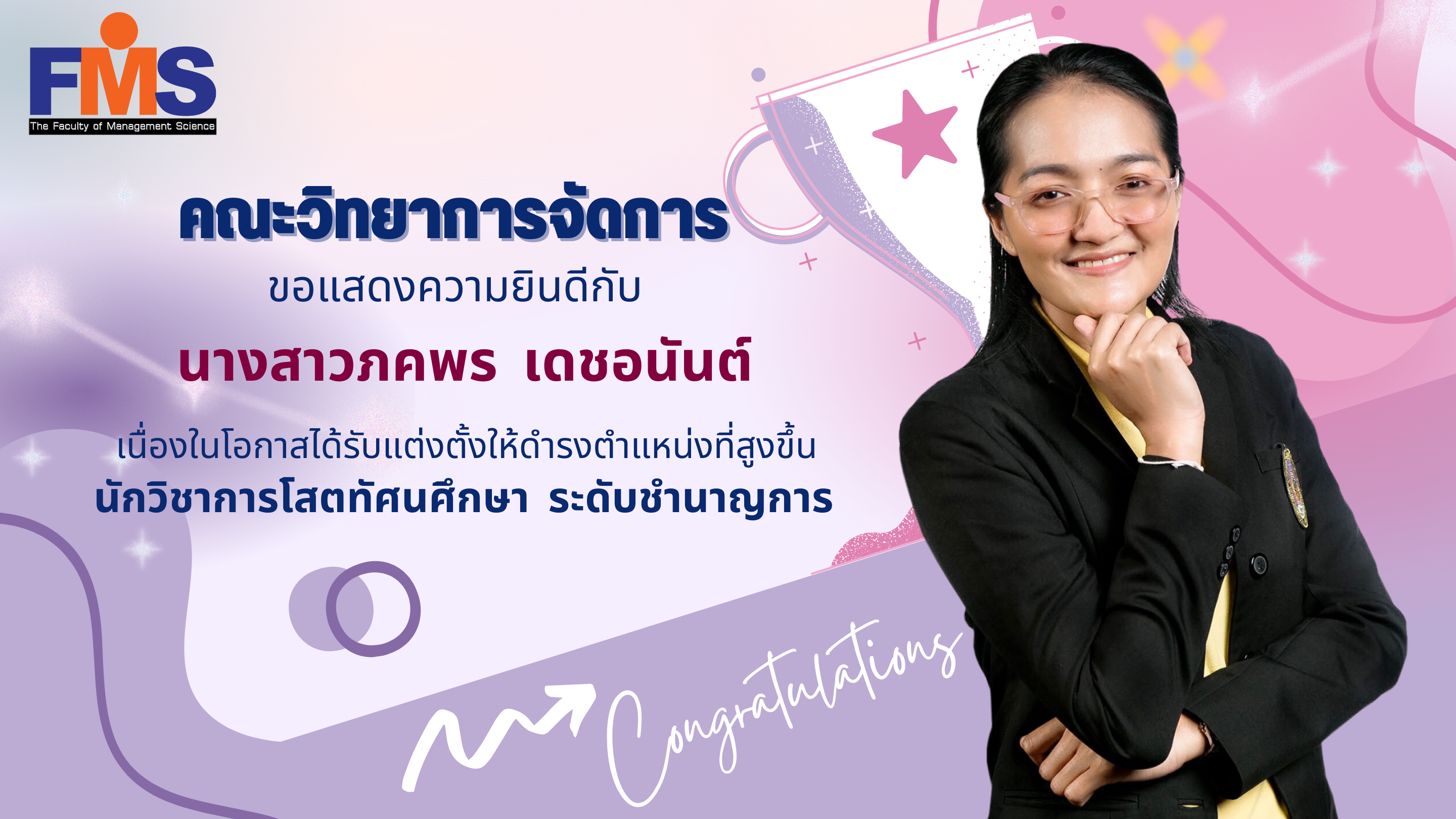 Faculty of Management Science ,Suan Sunandha Rajabhat University Congratulations to Miss Phakaporn Detanant on the occasion of being appointed to a higher position. (Expert Level) Audiovisual Studies Academician Expert level.
