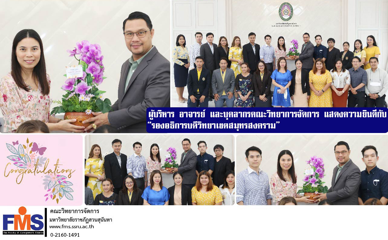 On October 2, 2023, Assistant Professor Dr. Somsak Klaysung, Dean of the Faculty of Management Science along with the deputy dean, professors, and academic support personnel of the faculty Give a bouquet of flowers to congratulate to Assistant Professor Dr Pharm. Pimporn Thongmuang on the occasion of being appointed to the position. Vice Rector of Samut Songkhram Campus Suan Sunandha Rajabhat University, at the President's Office Lounge, Building 31, 1st floor.