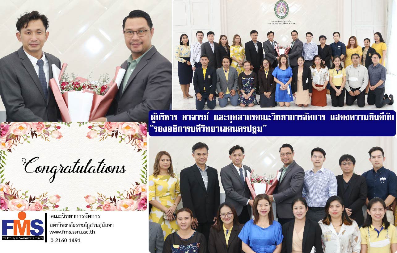 On October 2, 2023, Assistant Professor Dr. Somsak Klaysung, Dean of the Faculty of Management Science along with the deputy dean, professors, and academic support personnel of the faculty Presenting a bouquet of flowers to express congratulations to Professor Dr. Kaenphet Saranontawat on the occasion of being appointed to the position. Vice President, Nakhon Pathom Campus, Suan Sunandha Rajabhat University, at the President's Office Lounge, Building 31, 1st floor.