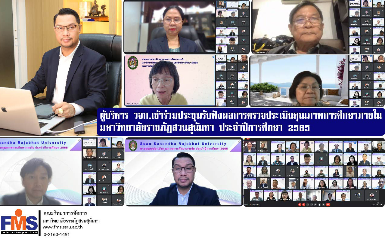 On October 18, 2023 at 10 a.m. Assistant Professor Dr. Somsak Klaysung, Dean of the Faculty of Management Science attend the meeting to listen to the internal educational quality assessment. Suan Sunandha Rajabhat University Academic year 2022 organized by the Policy and Planning Division. Office of the President with Associate Professor Dr. Nantiya Noichan, Vice President for Academic Affairs The chairman welcomed the committee of experts and listened to the results of the educational quality assessment. He was honored by Associate Professor Dr. Thai Thipsuwannakul The chairman of the committee, together with Associate Professor Chantanee Petcharanon, Assistant Professor Dr. Tuangrak Nanvisarnkul, Lecturer Dr. Thitidej Luetrakul, expert committee members, reported the results of the evaluation. In the form of online meetings via Google Meet.
