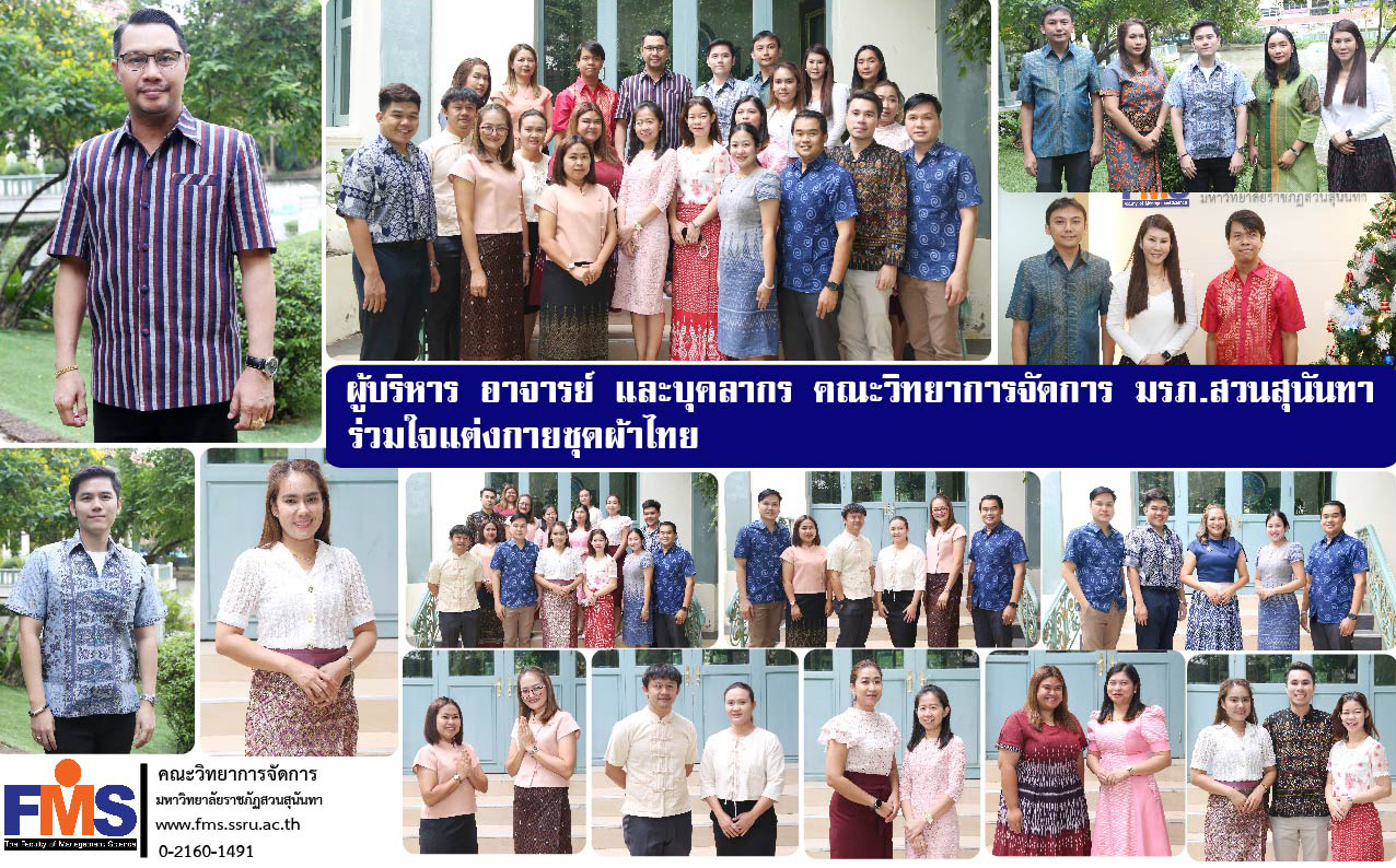 Faculty of Management Science Suan Sunandha Rajabhat University led by Assistant Professor Dr. Somsak Klaysung, Dean of the Faculty of Management Science. Along with the Deputy Dean, professors and academic support personnel, join in promoting and honoring Thai identity. Dress in Thai cloth Respond to the policies of the Faculty and University. By wearing Thai cloth or local cloth. To encourage executives Faculty and staff Faculty of Management Science participate in cultural conservation Dressing wisdom Continuing the culture of Thai cloth dressing and emphasizes being a palace To follow the same guidelines and support Thai fabric products and promote the unique culture of wearing Thai fabric widely. As well as working together to preserve Thai culture and dress traditions to continue existing in Thai society.