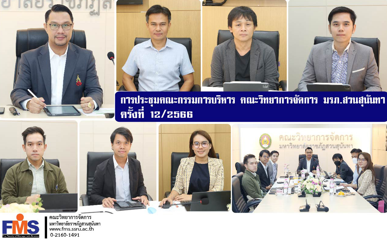 On December 22, 2023 at 9:30 a.m. Faculty of Management Science, Suan Sunandha Rajabhat University organized the Faculty Executive Committee Meeting No. 12/2023 by Assistant Professor Dr. Somsak Klaysung, Dean of the Faculty of Management Science. Chairing the meeting For this meeting, the format of the meeting was adjusted in response to the Digital University policy. By using electronic devices in meetings instead of paper. There are various important meeting agendas. with the Deputy Dean Head of the Dean's Office Attend the meeting at the Ruamjai Management meeting room.