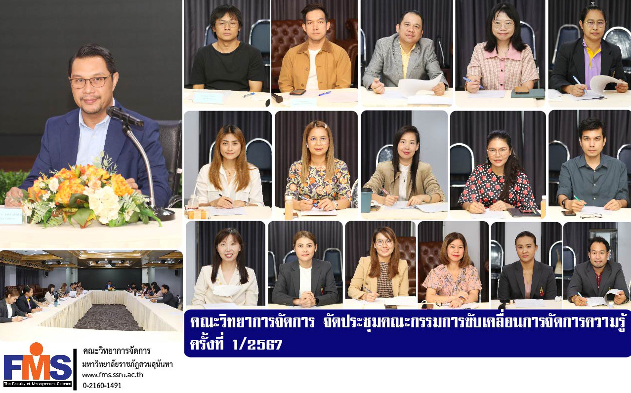 On March 5, 2024 at 10:00 a.m. Planning and Quality Assurance Department Faculty of Management Science organized a meeting of the Knowledge Management Steering Committee No. 1/2024 by Assistant Professor Dr. Somsak Klaysung, Dean of the Faculty of Management Lecturers. Chairing the meeting On the agenda related to notification of knowledge management systems, mechanisms and guidelines Fiscal year 2024 knowledge management plan Fiscal year 2024 and knowledge management (KM) for fiscal year 2024. Defining knowledge. Principles that are necessary or important to the work or activities of the agency and set knowledge management goals and other related agendas There is a group leader in Business Administration. Head of subject Head of subject Head of the Dean's Office Head of Educational Services Head of Research Development and Academic Services Department and personnel in the planning and quality assurance department Attended the meeting at Suwaphakniwet Conference Room (5724), Faculty of Management Science.