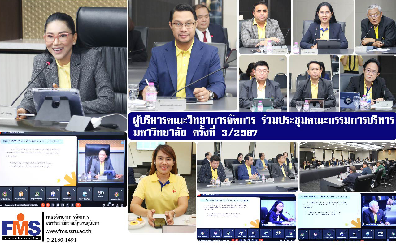 On March 11, 2024 at 8:30 a.m. Assistant Professor Dr. Somsak Klaysung, Dean of the Faculty of Management Science along with Miss Jinjutha Srihera, Head of the Dean's Office, Faculty of Management Science Attended the University Executive Committee meeting No. 3/2024 with Associate Professor Dr. Chutikarn Sriwiboon, President of Suan Sunandha Rajabhat University. Chairing the meeting There are university administrators, faculties, departments, campuses, and educational centers. Attend the meeting at the University Council meeting room, Building 31, 5th floor, and meet online with the Google Meet program.