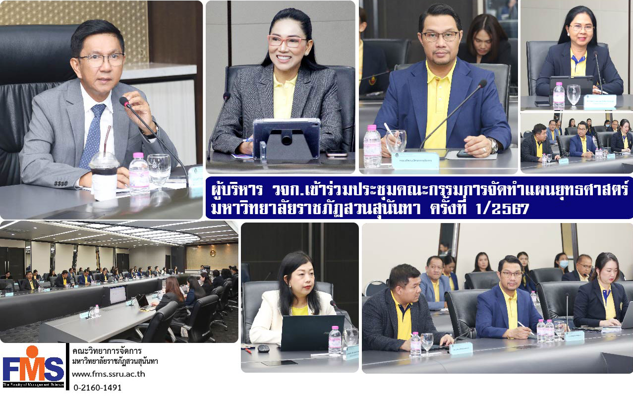 On March 11, 2024 at 1:00 p.m., Assistant Professor Dr. Somsak Klaysung, Dean of the Faculty of Management Science Participate in strategic plan committee meetings. Suan Sunandha Rajabhat University No. 1/2024 by Associate Professor Dr. Luedech Girdwichai, President of Suan Sunandha Rajabhat University Council Chairing the meeting along with Associate Professor Dr. Chutikarn Sriwiboon, President of Suan Sunandha Rajabhat University with university administrators Educational agency administrators and related personnel Attended the meeting at the University Council meeting room, Building 31, 5th floor.