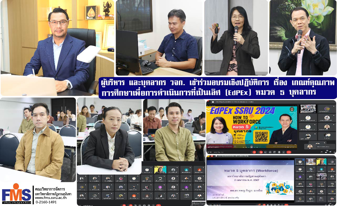 April 2, 2024, 9:00 a.m. - 4:00 p.m., Assistant Professor Dr. Somsak Klaysung, Dean of the Faculty of Management Science along with Lecturer Dr. Pitimanus Banlue, Deputy Dean for Administration, Lecturer Dr. Itthipoom Promma, Deputy Dean for Planning and Quality Assurance. Assistant Professor Dr. Phisit Pojanajaruwit, Head of the Business Administration Department Lecturer Premjai Ueajit, Head of Human Resource Management and Mr. Chatlikit Nim-ngam, personnel in the planning and quality assurance department Participated in a workshop on “Educational Quality Criteria for Excellence (EdPEx), Section 5 Personnel, organized by the Policy and Planning Division. which was honored by Assistant Professor Dr. Ratchada Chaijit, Deputy Dean for Strategy. Faculty of Dentistry Khon Kaen University and Associate Professor Dr. Anant Mungwattana from the Department of Industrial Engineering. Faculty of Engineering Kasetsart University TQA/EdPEx Assessor and the Technical Subcommittee on National Quality Award Criteria were speakers. University administrators, executives of educational management agencies, consisting of deans, deputy deans and related personnel, attended the training at the Chokaew meeting room, Building 31, 5th floor, Suan Sunandha Rajabhat University. and online training using the Google Meet program.