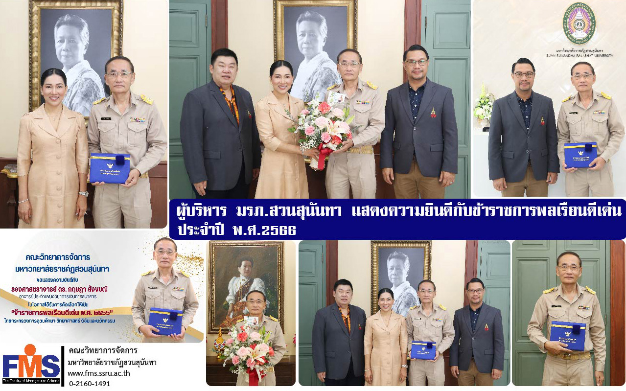 On 3 April 2024 Associate Professor Dr. Chutikarn Sriwiboon, President of Suan Sunandha Rajabhat University Join us in congratulating Associate Professor Dr. Kritsada Sangkhamanee, lecturer in the field of finance and banking. Faculty of Management Science On the occasion of receiving the certificate and pin of honor for outstanding civil servants for the year 2023 from the Ministry of Higher Education, Science, Research and Innovation. To praise and honor and disseminate the honor of outstanding civil servants Including praising and promoting civil servants who practice good deeds, have morality, ethics and are good examples. and has empirically outstanding performance Including being a person with determination Determined to work fully At the same time, it is also considered an honor. And it is the pride of the Faculty of Management Science personnel. Suan Sunandha Rajabhat University as well with Associate Professor Dr. Bundit Phangniran, Vice President for Research and Development and Assistant Professor Dr. Somsak Klaysung, Dean of the Faculty of Management Science Join in expressing congratulations at Sai Sutthanapadon Building. Suan Sunandha Rajabhat University.