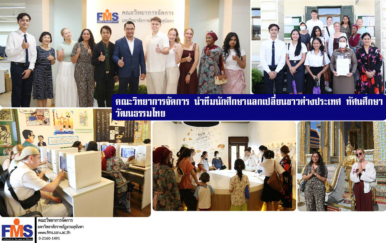 The Faculty of Management Science, Suan Sunandha Rajabhat University welcomed a team of 7 international exchange students from De Montfort University (DMU), United Kingdom. The team was welcomed by Assistant Professor Dr. Somsak Klaysung, Dean of the Faculty of Management Science, and Assistant Professor Dr. Pongsavee Suphanon, Deputy Dean for Student Affairs. The team was led by Assistant Professor Dr. Rampapak Rerkwirawattana, Lecturer of the Business Entrepreneurship Program, along with staff and student representatives. The exchange students were taken on a study trip to learn about Thai culture, such as knowledge about Thailand, Thai culture, Thai food, and Thai clothing. They also had the opportunity to visit important tourist attractions in Thailand, including Wat Phra Sri Rattana Satsadaram (Wat Phra Kaew), Wat Pho, and the Museum of Knowledge or Museum Siam, Bangkok. During the activity, all international students were able to experience Thainess in various dimensions and were happy, entertained, and impressed.