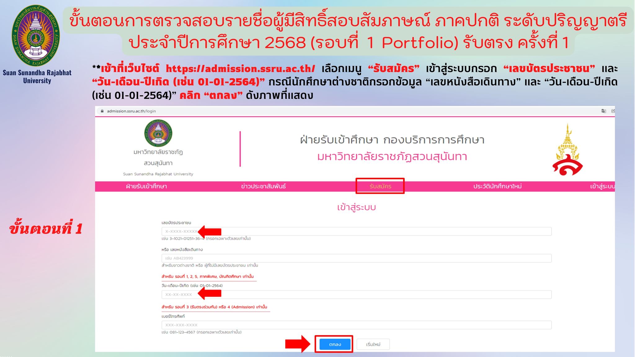 Suan Sunandha Rajabhat University announces the list of applicants eligible for the interview for the regular semester, bachelor's degree level, academic year 2025 (Round 1 Portfolio), direct admissions, round 1. You can check the list of applicants at the website https://admission.ssru.ac.th/login.