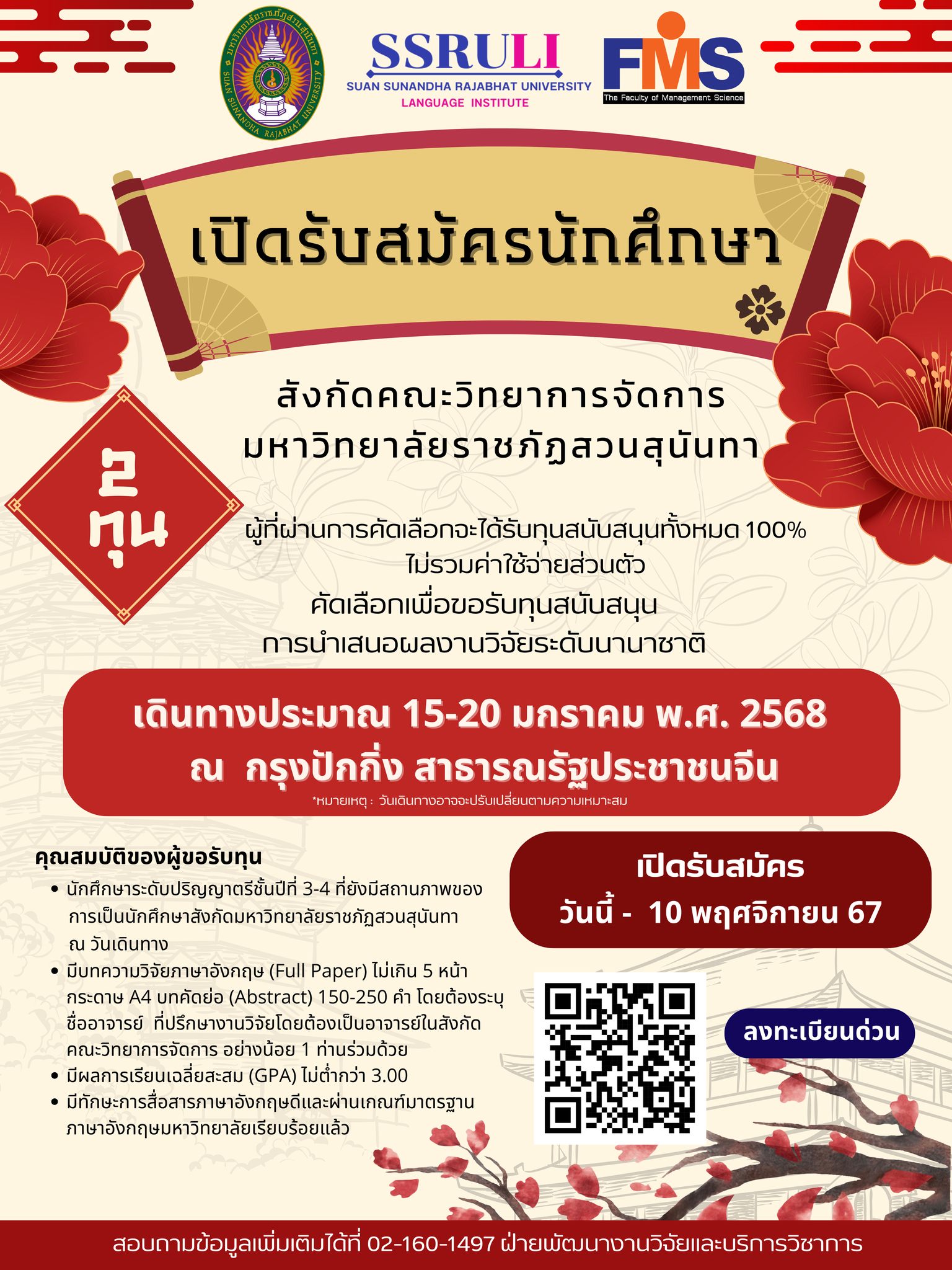 Applications are now open for students to apply for an international research presentation grant in Beijing, Republic of China. Applications are open until November 10, 2024. For more information, please contact the Research and Academic Services Development Division at 0-2160-1497.
