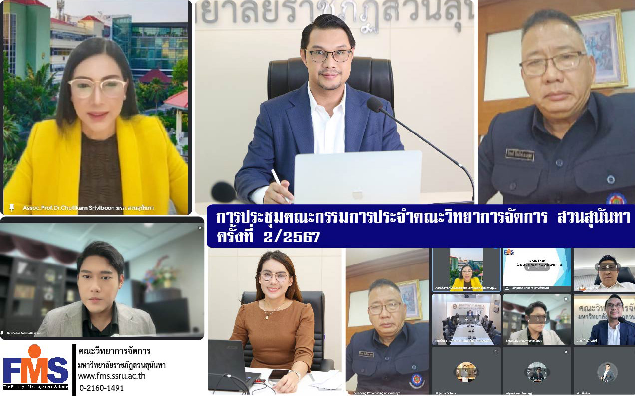 On November 25, 2024 at 2:00 p.m., the Faculty of Management Science, Suan Sunandha Rajabhat University organized the 2/2023 Faculty Committee Meeting, chaired by Associate Professor Dr. Chutikan Srivibul, President of Suan Sunandha Rajabhat University, along with Assistant Professor Dr. Nattapat Kaewrattanaphat, Vice President for Academic Affairs, Assistant Professor Dr. Somsak Klaysung, Dean of the Faculty of Management Science, external experts, Lieutenant General Thiraphong Patamasingh Na Ayutthaya, Mr. Wirat Rojayarun, and the Faculty Committee, who attended the meeting at the Management Unity Meeting Room 1, Faculty of Management Science, and the meeting was held online via Google Meet.