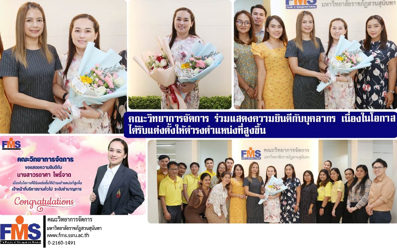 On February 17, 2025, the Faculty of Management Science, Suan Sunandha Rajabhat University, led by Assistant Professor Dr. Chutima Klaysung, Dean of the Faculty of Management Science, along with Dr. Jirapan Chanwichian, Deputy Dean for Business Development and Revenue Generation, Ms. Jinjutha Srihero, Head of the Dean's Office, and academic support personnel of the Faculty presented a bouquet of flowers to congratulate Ms. Radasa Phothijad on the occasion of being appointed to a higher position, General Administration Officer, Expert Level, at the Dean's Office, Faculty of Management Science.
