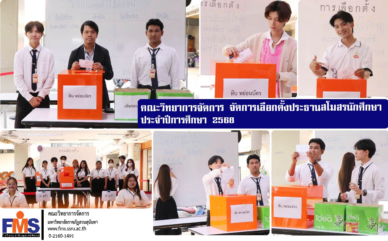On March 21, 2025, the Student Affairs and Arts and Culture Office of the Faculty of Management Science at Suan Sunandha Rajabhat University held an election for the Student Club President for the academic year 2025. The event was led by Asst. Prof. Dr. Pongsawee Supanonth, the Associate Dean for Student Affairs, who opened the ballot box and joined as a witness. The event was organized by the Student Affairs Committee and the Student Club Committee at the activity area under Building 56.