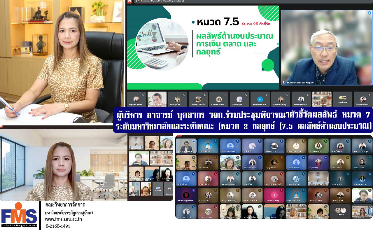 On April 4, 2025, at 2:30 pm, Asst. Prof. Dr. Chutima Klaysung, Dean of the Faculty of Management Science, along with all Associate Deans, the Head of the Office, faculty members from the Business Economics Department, and staff from the Planning and Quality Assurance Department, attended a meeting to review outcome indicators for Category 7: University and Faculty Level (Category 2: Strategy (7.5 Results in Budget, Finance, Market, and Strategy)).