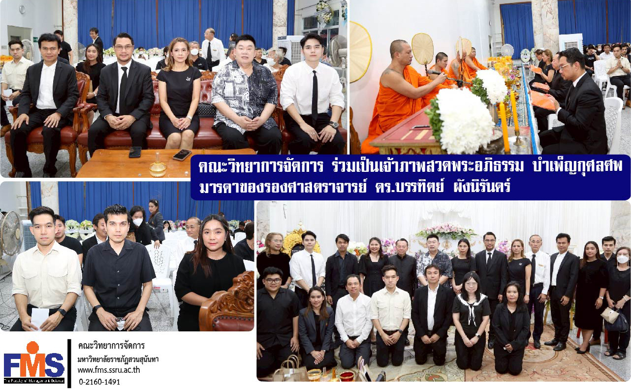 On May 23, 2025 at 7:00 p.m., the Faculty of Management Science, Suan Sunandha Rajabhat University, co-hosted the funeral rites for Mrs. Suingon Phangnirun, mother of Associate Professor Dr. Bhandit Phangnirun, Vice President for Business Development and Revenue Generation. The ceremony was honored by Assistant Professor Dr. Somsak Klaising, Vice President for Student Affairs, and Assistant Professor Dr. Chutima Klaysung, Dean of the Faculty of Management Science, as the chairpersons of the ceremony, along with Assistant Professor Pol. Lt. Gen. Dr. Santhan Chayanon, Dean of the College of Politics and Governance, along with all deputy deans, faculty members, heads of the Dean’s Offices, and academic support personnel from the Faculty, who joined the rites at Sala 1, Pariwas Ratchasongkram Temple, Bangkok.