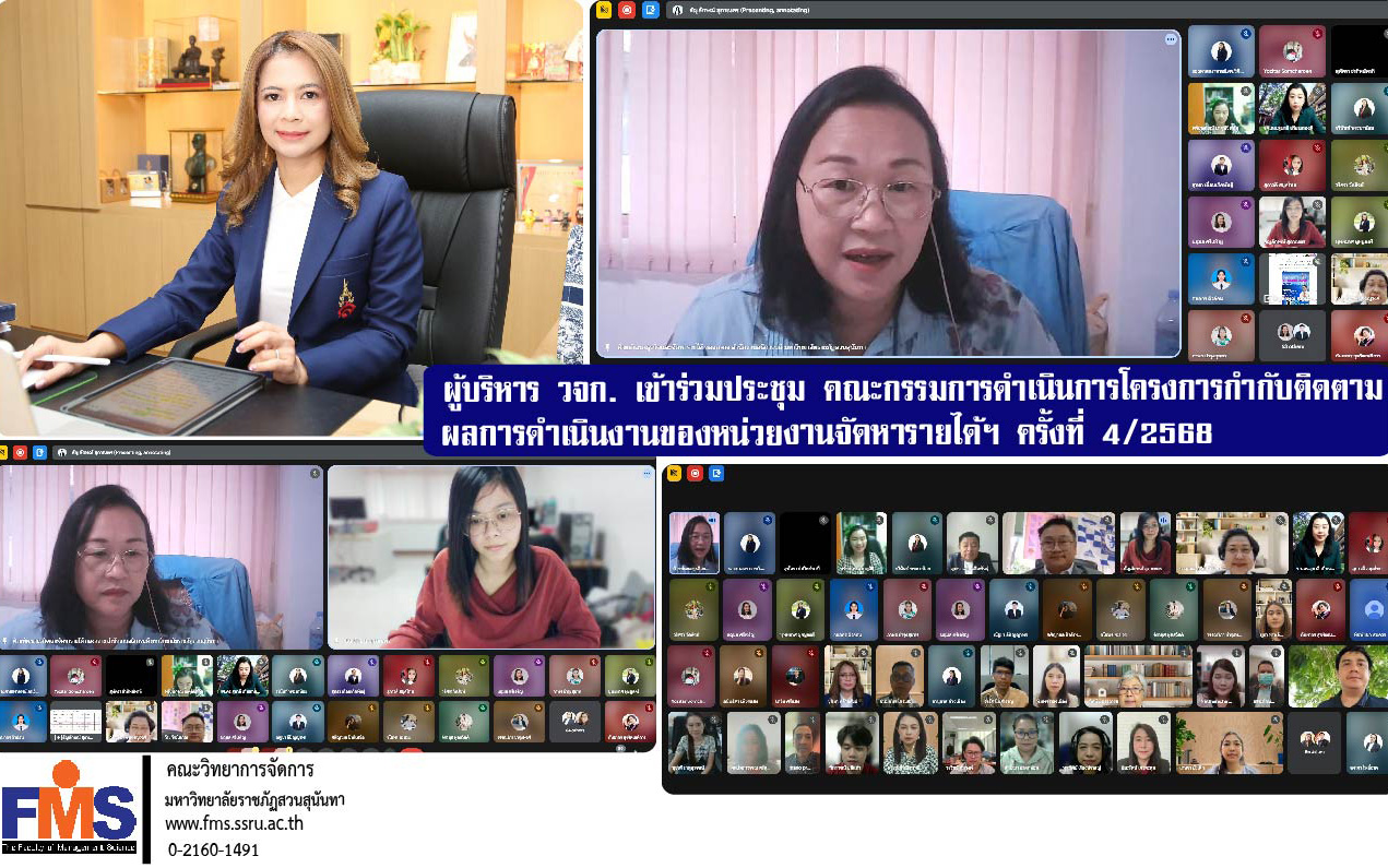 On May 28, 2025, Assistant Professor Dr. Chutima Klaysung, Dean of the Faculty of Management Science, along with Dr. Jirapan Chanwichian, Deputy Dean for Business Development and Revenue Generation, Dr. Jinjutha Srihera, Head of the Dean's Office, and Mr. Phayaw Numruengrun, Personnel of the Business Development and Revenue Generation Division, attended the 4/2025 meeting of the Executive Committee for the Monitoring and Evaluation of Revenue Generation Units of Suan Sunandha Rajabhat University for Fiscal Year 2025. Ms. Praneeporn Boonpraphasri, Internal Auditor, was assigned by Associate Professor Dr. Bandit Phangnirun, Vice President for Business Development and Revenue Generation, to chair the meeting. Executives and personnel responsible for the indicators attended the meeting in an online meeting format using the Google Meet program.