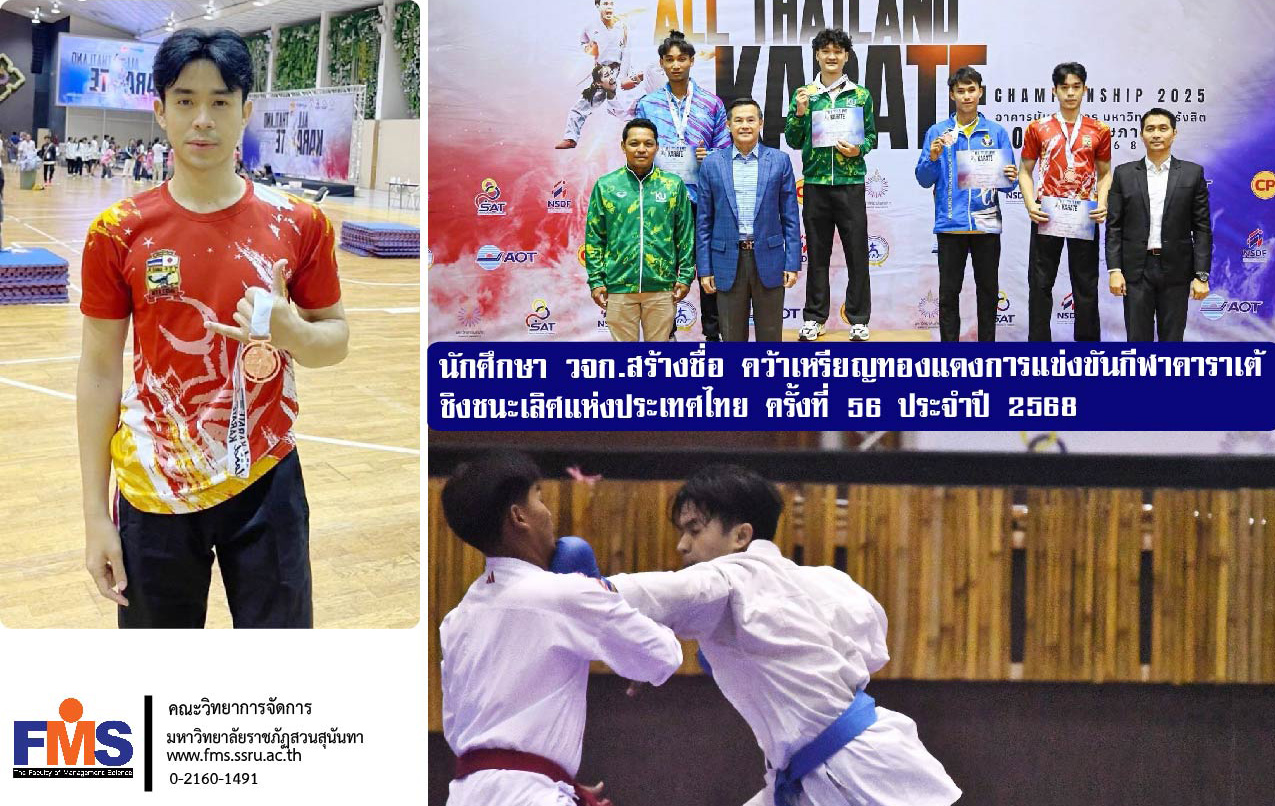 Faculty of Management Science, Suan Sunandha Rajabhat University would like to congratulate Mr. Suthipat Kamonphan, a third-year student in the Human Resource Management program, on winning a bronze medal in the Individual Fighting category, senior -67kg category, in the 56th All Thailand Karate Championship 2025 at Rangsit University.