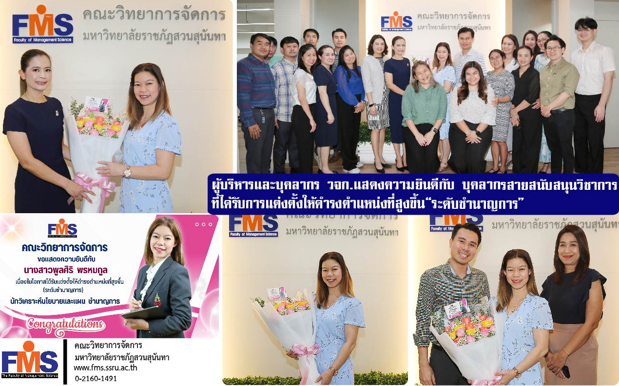 Assistant Professor Dr. Chutima Klaysung, Dean of the Faculty of Management Sciences, along with Dr. Pitimanus Banlue, Deputy Dean for Administration, and academic support personnel of the Faculty, presented a bouquet of flowers to congratulate Ms. Poonsiri Promkul on the occasion of being appointed to a higher position (expert level), Policy and Plan Analyst, Expert, at the Dean's Office, Faculty of Management Sciences, Building 56, 1st Floor.