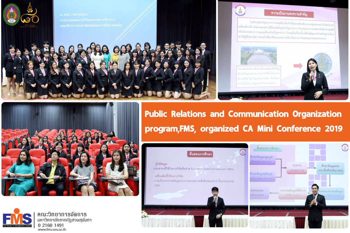 On April 30, 2019, Public Relations and Communication Organization program, Faculty of Management Science, Suan Sunandha Rajabhat University, organized ICMSITS 2019 CA Mini Conference. Presenting research of students. Honored by external professional from leading university as the Committee criticized of research articles at Mini Theater Room, 6th Floor, Faculty of Management Science building.