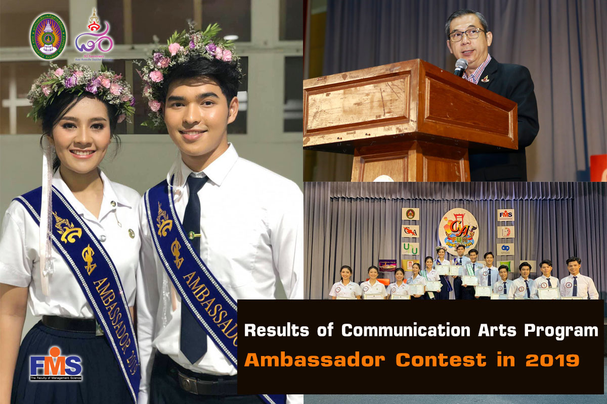 On 15 September 2019, at Sunandhanusorn Auditorium,Suan Sunandha Rajabhat University. Communication Arts Program ,Faculty of Management Science organized the "C.A. Ambassador 2019" contest under the concept of "C.A. Fun in 4 regions" with the honor of Assistant Professor Dr. Prateep Wajeethongratana, Dean of Faculty of Management Science presided over the opening speech.The results showed that Mr. Phatthanat Boonlert (Ford) and Miss Charinrat Karnplook (Mind) took the position of C.A. Ambassador 2019, Communication Arts, Class 34, Faculty of Management Science in 2019.