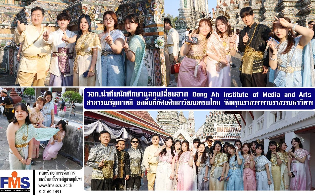 On January 9, 2026, the Faculty of Management Science, Suan Sunandha Rajabhat University, led by Assistant Professor Dr. Nattapong Techaratanaset, Deputy Dean for Research and Academic Services, along with Dr. Kwanchat Wongchanthip, a lecturer in the Accounting Department, took students from Dong Ah Institute of Media and Arts, Republic of Korea, on a field trip to learn about Thai culture. The students gained knowledge about Thailand, Thai culture, Thai food, and Thai traditional clothing. They also had the opportunity to visit important Thai tourist attractions, including Wat Arun Ratchawararam Ratchaworamahaviharn. Through this activity, the international students experienced various aspects of Thai culture, including wearing traditional Thai clothing, and enjoyed the experience immensely.