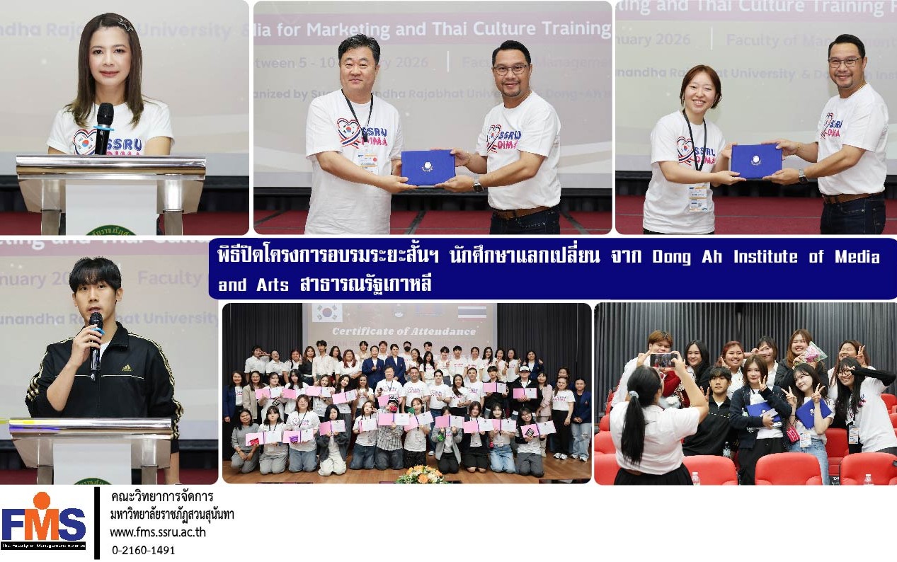 The Faculty of Management Science, Suan Sunandha Rajabhat University, held a closing ceremony for the 2026 Short-Term Training Program in Media Production for Marketing and Thai Cultural Exchange. Certificates and souvenirs were presented to Mr. Jang Byung Min, Dean of the Faculty of Content Creation, and 16 students from Dong Ah Institute of Media and Arts, Republic of Korea, who participated in the program from January 5-10, 2026. Assistant Professor Dr. Chutima Klaysung, Dean of the Faculty of Management Science, along with Assistant Professor Dr. Nattapong Techaratanaset, Vice Dean for Research and Academic Services, Dr. Jeeraphan Chanwichien, Vice Dean for Business Development and Fundraising, Dr. Kwanchat Wongchanthip, lecturer in Accounting, led faculty members, students from the Faculty of Management Science Student Club, and student representatives from the first and second cohorts of the short-term training program in media production for marketing and Thai cultural exchange. The ceremony was honored by the presence of Associate Professor Dr. Somsak Klaysung, Vice President for Student Affairs, who presented the certificates. Associate Professor Dr. Chutima Klaysang, Dean of the Faculty of Management Science, gave the closing remarks and presented souvenirs. Following this, Mr. Jang Byung Min, Dean of the Faculty of Content Creation, expressed his gratitude and appreciation. A student representative from Dong Ah Institute of Media and Arts then summarized the training results, shared their feelings about the program, and expressed gratitude to the administrators, faculty, staff, and students of the Faculty of Management Science for their care and support throughout the project. The event concluded with student presentations of their work following the training, held in the Mini Theater, 6th floor, Building 57, Suan Sunandha Rajabhat University.