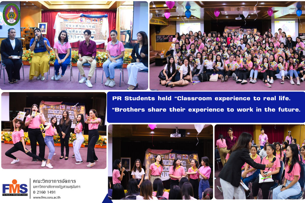 Public Relations and Corporate Communication students ,Faculty of Management Science, Suan Sunandha Rajabhat University organized the project "classroom experience to real life"at Suwaphakniwej meeting room (5724). The objective of creating knowledge understanding and inspire first-year students at 3 Public Relations and Corporate Communication including advice on how to apply what they have learned in real life to improve themselves and prepare them for future work.