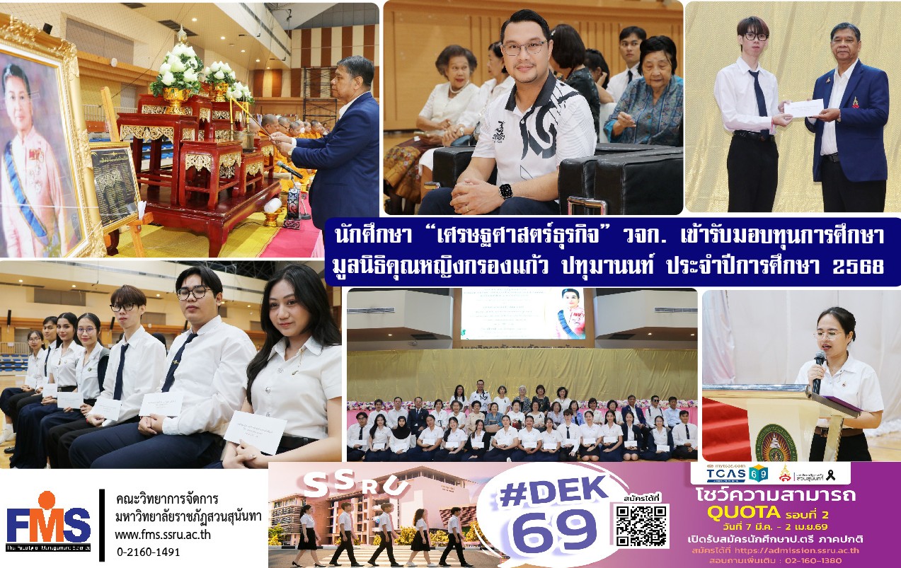 The scholarship award ceremony, generously supported by the Khunying Krongkaew Patumanon Foundation, was organized to promote and provide financial support to students who demonstrate outstanding academic performance in accordance with the foundation’s criteria. On this occasion, the Faculty of Management Science would like to extend its congratulations to the student who received the scholarship.
