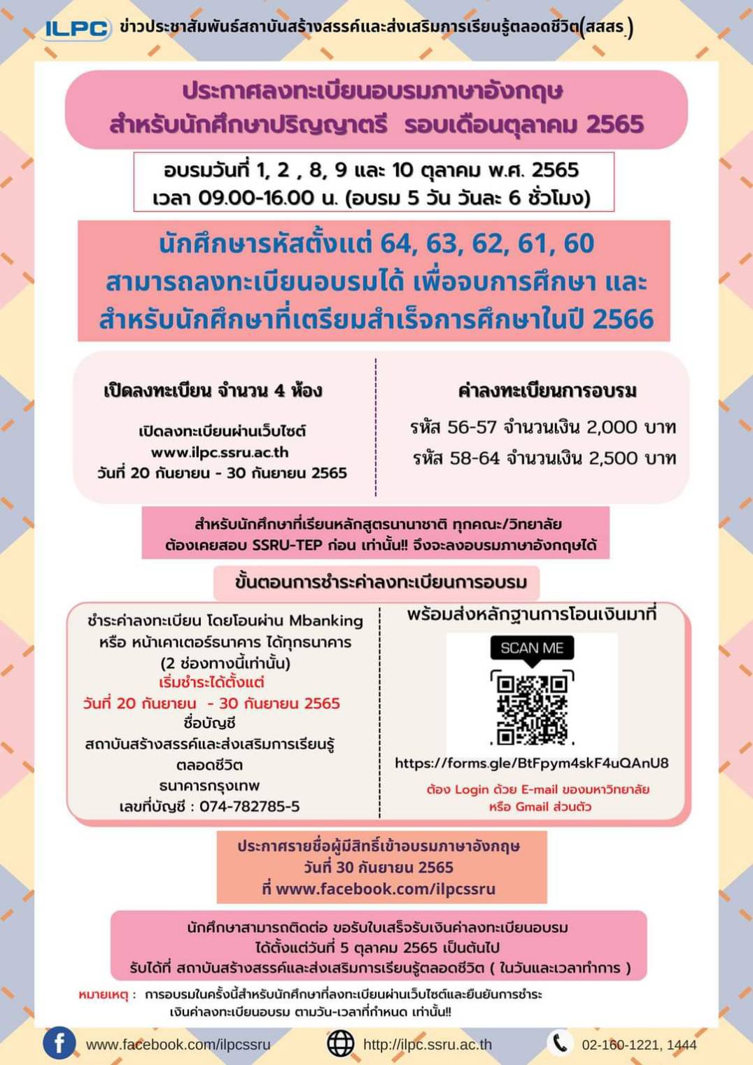 > ประกาศลงทะเบียนอบรมภาษาอังกฤษ สำหรับนักศึกษาปริญญาตรี รอบเดือนตุลาคม 2565