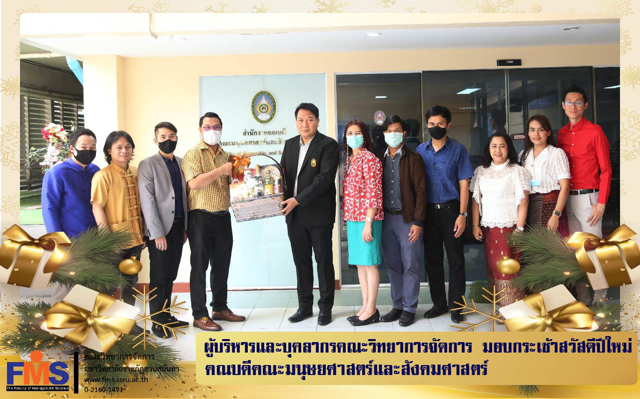 วันที่ 25 ธันวาคม 2563 คณะวิทยาการจัดการ นำโดย ผู้ช่วยศาสตราจารย์ ดร.สมศักดิ์ คล้ายสังข์ คณบดี และคณะผู้บริหาร รองคณบดี อาจารย์ หัวหน้าสำนักงานคณบดี บุคลากรสายสนับสนุนวิชาการ ได้เข้าพบและมอบกระเช้าของขวัญปีใหม่แด่ ผู้ช่วยศาสตราจารย์ ดร.นิพนธ์ ศศิธรเสาวภา คณบดีคณะมนุษยศาสตร์และสังคมศาสตร์ เนื่องในโอกาสส่งท้ายปีเก่าต้อนรับปีใหม่ 2564 ณ คณะมนุษยศาสตร์และสังคมศาสตร์ มหาวิทยาลัยราชภัฏสวนสุนันทา