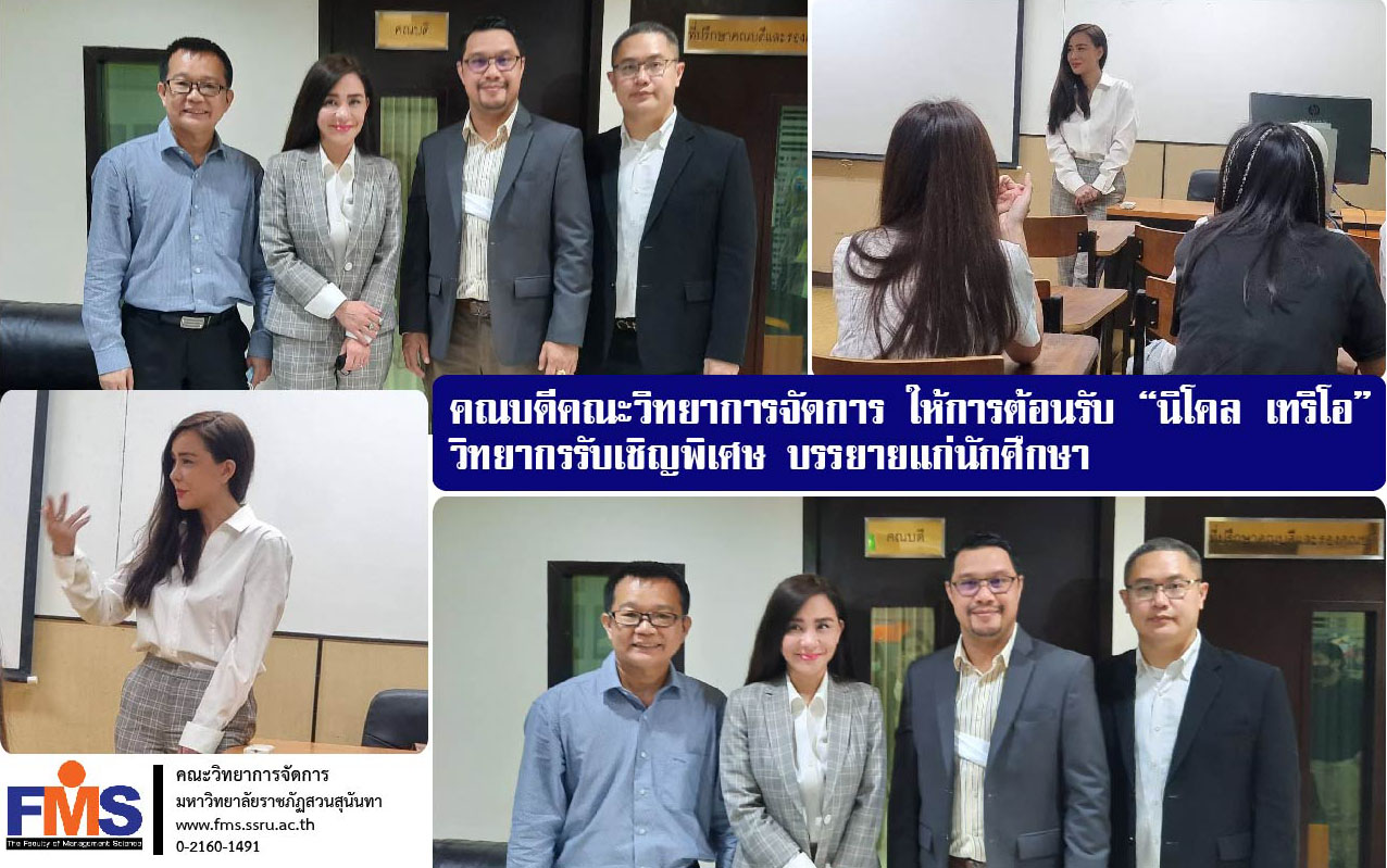 วันที่ 22 กุมภาพันธ์ 2564 ผู้ช่วยศาสตราจารย์ ดร. สมศักดิ์ คล้ายสังข์ คณบดีคณะวิทยาการจัดการ ให้การต้อนรับคุณนิโคล เทริโอ นักร้องนักแสดงชื่อดัง ซึ่งให้เกียรติรับเชิญเป็นวิทยากรบรรยายพิเศษ วิชา MCA1103 จริยธรรมและกฎหมายสื่อสารมวลชน 2/2563 แก่นักศึกษา พร้อมกันนี้คณบดีได้ร่วมพูดคุยกับผู้ช่วยศาสตราจารย์วิโรจน์ ศรีหิรัญ อาจารย์ประจำแขนงวิชาวารสารศาสตร์ วิทยาลัยนิเทศศาสตร์ ถึงแนวทางความร่วมมือทางวิชาการในอนาคต ณ สำนักงานคณบดี คณะวิทยาการจัดการ