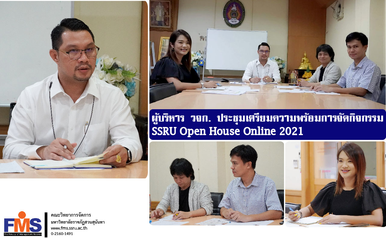 วันที่ 18 มีนาคม 2564 เวลา 10.00 น. ผู้บริหารคณะวิทยาการจัดการ มหาวิทยาลัยราชภัฏสวนสุนันทา จัดประชุมเตรียมความพร้อมการจัดกิจกรรม SSRU Open House Online 2021 โดยมีผู้ช่วยศาสตราจารย์ ดร.สมศักดิ์ คล้ายสังข์ คณบดีคณะวิทยาการจัดการ เป็นประธานการประชุม ร่วมด้วยอาจารย์ปิติมนัส บรรลือ รองคณบดีฝ่ายบริหาร อาจารย์ ดร.กฤษณะ เชื้อชัยนาท รองคณบดีฝ่ายวิชาการ และนางสาวกันยากร สุจริตเนติการนักประชาสัมพันธ์ เพื่อวางแผนการดำเนินการจัดกิจกรรม SSRU Open House Online 2021 ที่จะจัดขึ้นในวันที่ 31 มีนาคม – 1 เมษายน 2564 นี้ ณ ห้องประชุมสโมสรนักศึกษา คณะวิทยาการจัดการ