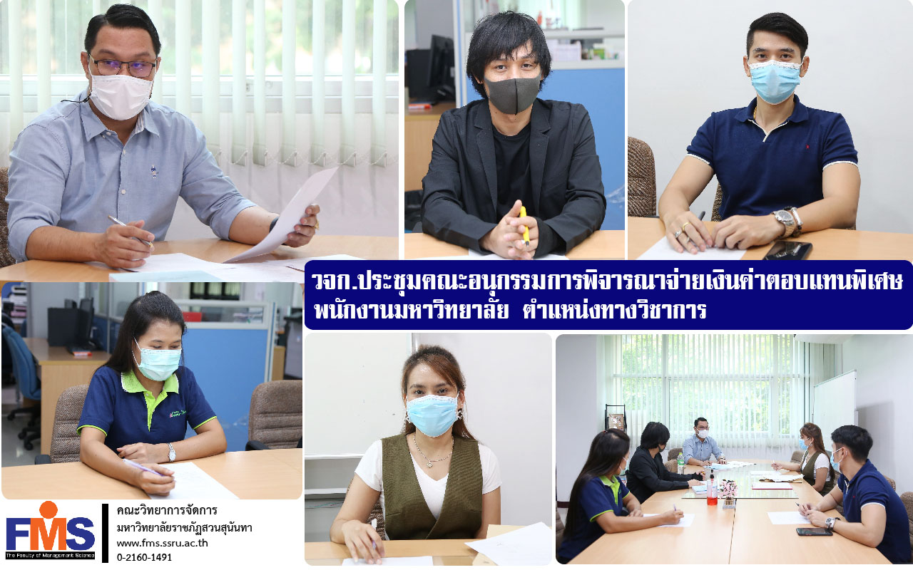 วันที่ 27 พฤษภาคม 2564 เวลา 14.00 น. คณะวิทยาการจัดการ มหาวิทยาลัยราชภัฏสวนสุนันทา จัดประชุมคณะอนุกรรมการพิจารณาจ่ายเงินค่าตอบแทนพิเศษ พนักงานมหาวิทยาลัย ตำแหน่งทางวิชาการ โดยผู้ช่วยศาสตราจารย์ ดร.สมศักดิ์ คล้ายสังข์ คณบดีคณะวิทยาการจัดการ เป็นประธานการประชุม เพื่อพิจารณากลั่นกรองผลงานที่ยื่นคำขอรับค่าตอบแทนพิเศษตามประกาศมหาวิทยาลัยราชภัฏสวนสุนันทา เรื่อง หลักเกณฑ์การขอรับเงินค่าตอบแทนพิเศษ ตำแหน่งทางวิชาการ ของบุคลากรในสังกัด ก่อนนำเสนอคณะกรรมการบริหารกองทุนพัฒนาบุคลากร มีคณะอนุกรรมการ ประกอบด้วย คณบดี รองคณบดีฝ่ายวิชาการ รองคณบดีฝ่ายวิจัยและบริการวิชาการ หัวหน้าสาขาวิชาที่เกี่ยวข้อง หัวหน้าสำนักงานคณบดี เข้าร่วมประชุมเพื่อพิจารณาร่วมกัน ณ ห้องประชุมฝ่ายวิจัยและบริการวิชาการ อาคาร 56 ชั้น 2 คณะวิทยาการจัดการ