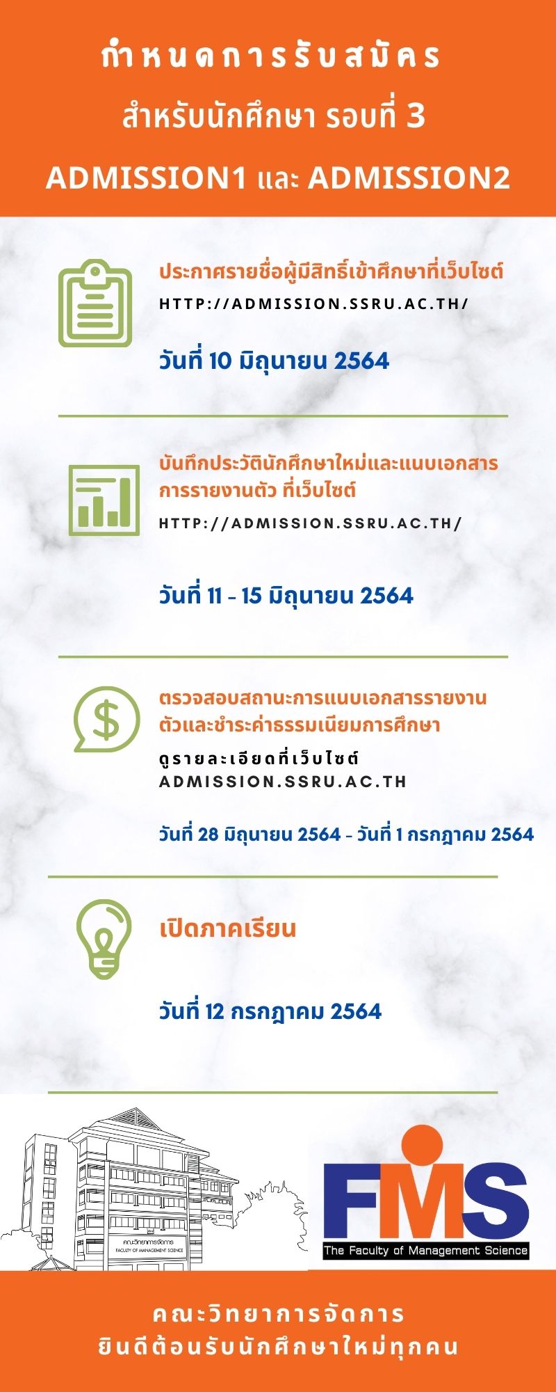 กำหนดการรับสมัคร ภาคปกติ ระดับปริญญาตรี ประจำปีการศึกษา 2564 (รอบที่ 3 Admission1) และ (รอบที่ 3 Admission2) คลิกภาพ >>>รายละเอียด คลิก>>https://bit.ly/3wIfvQQ