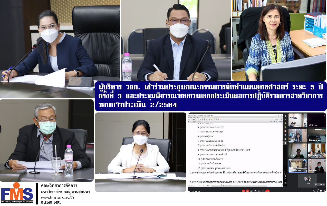 วันที่ 24 มิถุนายน 2564 เวลา 13.00 น. ผู้ช่วยศาสตราจารย์ ดร.สมศักดิ์ คล้ายสังข์ คณบดีคณะวิทยาการจัดการ พร้อมด้วยผู้ช่วยศาสตราจารย์ลัดดา หิรัญยวา รองคณบดีฝ่ายแผนงานและประกันคุณภาพ คณะวิทยาการจัดการ และนางสาวปาริฉัตร  จันทร์นวล บุคลากรฝ่ายแผนงานและประกันคุณภาพ  เข้าร่วมประชุมคณะกรรมการจัดทำแผนยุทธศาสตร์ ระยะ 5 ปี (พ.ศ. 2565 - 2569) และแผนปฏิบัติราชการประจำปีงบประมาณ พ.ศ. 2565 ครั้งที่ 3 และประชุมพิจารณาทบทวนแบบประเมินผลการปฏิบัติราชการสายวิชาการ  รอบการประเมิน 2/2564   โดยรองศาสตราจารย์ ดร.ชุติกาญจน์ ศรีวิบูลย์ อธิการบดี เป็นประธานการประชุม    ในวาระที่สำคัญเกี่ยวกับ การพิจารณากำหนดประเด็นยุทธศาสตร์และตัวชี้วัดของแผนยุทธศาสตร์ระยะ 5 ปี (พ.ศ. 2565 - 2569) และแผนปฏิบัติราชการประจำปีงบประมาณ พ.ศ. 2565 และการพิจารณาทบทวนแบบประเมินผลการปฏิบัติราชการสายวิชาการ  รอบการประเมิน 2/2564    รวมทั้งวาระอื่นๆ ที่เกี่ยวข้อง  ณ ห้องประชุมสภามหาวิทยาลัย อาคาร 31 ชั้น 5 และประชุมผ่านระบบออนไลน์ Google Meet