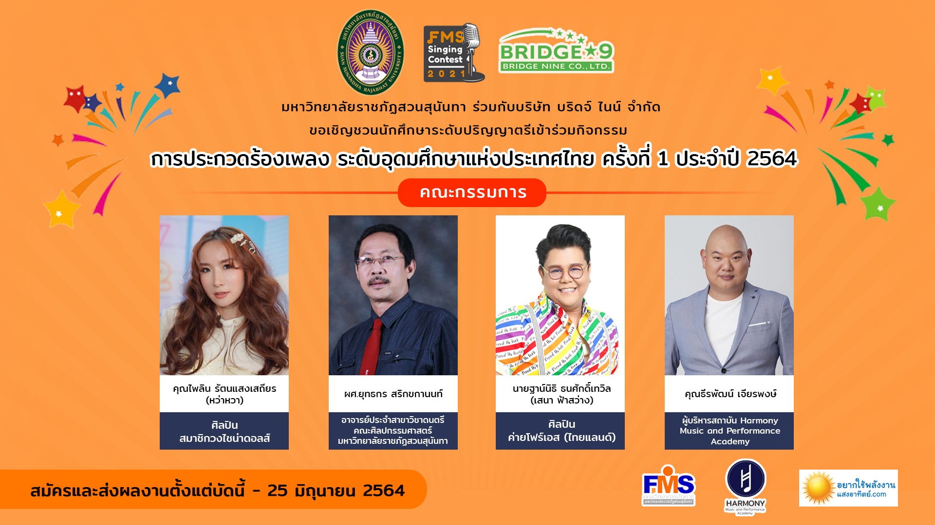 ประชาสัมพันธ์ เปิดเผยโฉมหน้าคณะกรรมการตัดสินการประกวดร้องเพลง ระดับอุดมศึกษาแห่งประเทศไทย ครั้งที่ 1 ประจำปี 2564