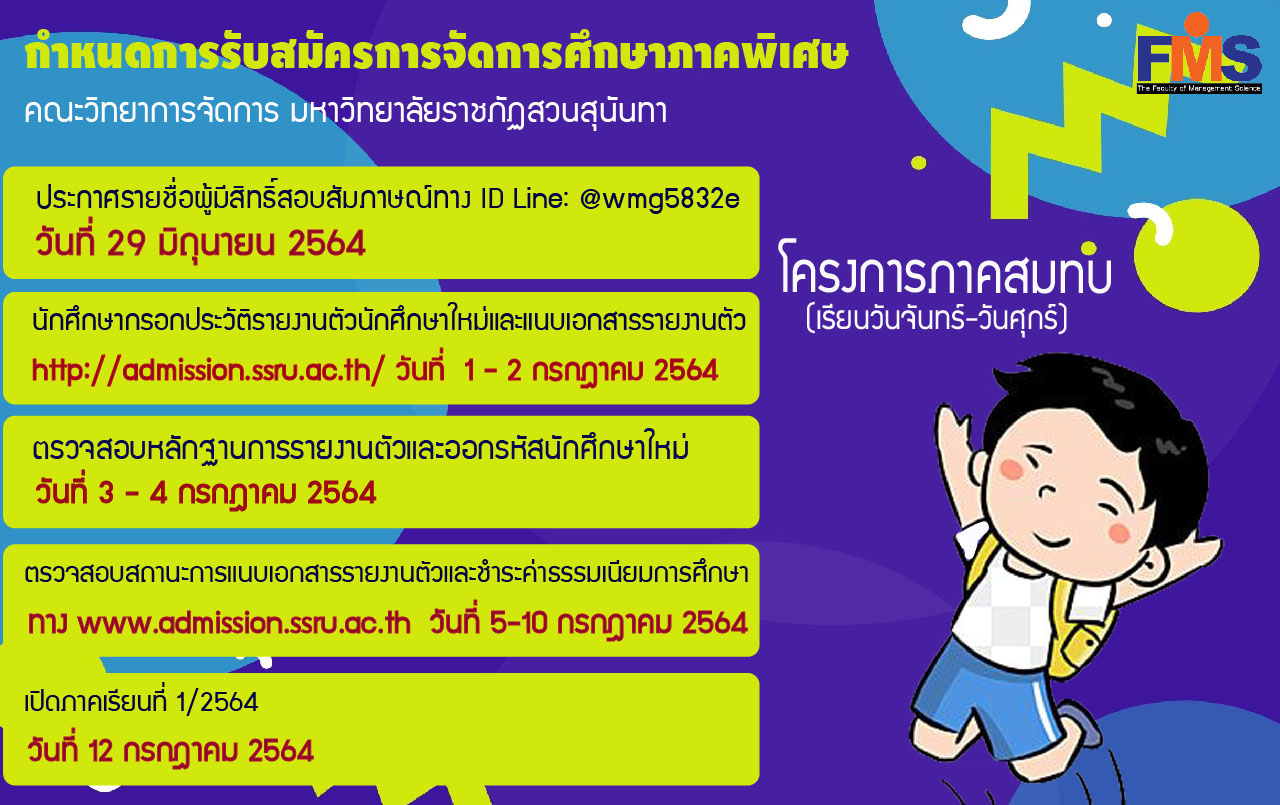 กำหนดการรับสมัครนักศึกษา การจัดการศึกษาภาคพิเศษ โครงการภาคสมทบ คณะวิทยาการจัดการ มหาวิทยาลัยราชภัฏสวนสุนันทา ประจำปีการศึกษา 2564 (เรียนวันจันทร์ถึงวันศุกร์ เวลา 16.00 - 20.00 น.)